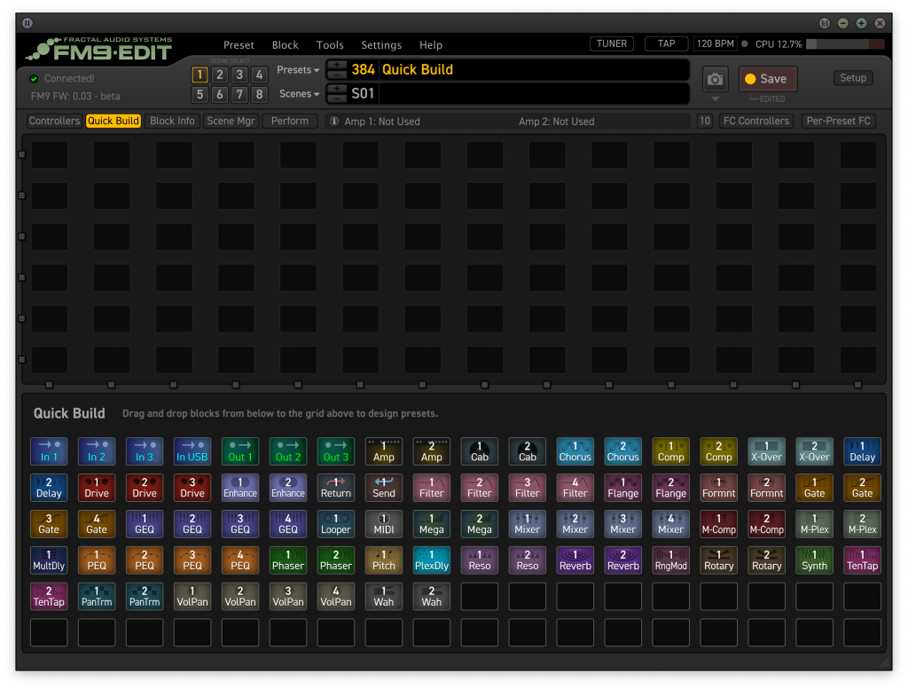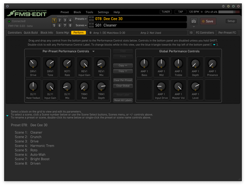 View entire presets at a glance, edit blocks and parameters, copy/paste, drag and drop, and more. Speed your workflow with Templates, or use the Library to access favorite settings in one click. Easily set up all aspects of onboard footswitches or a connected FC Controller.