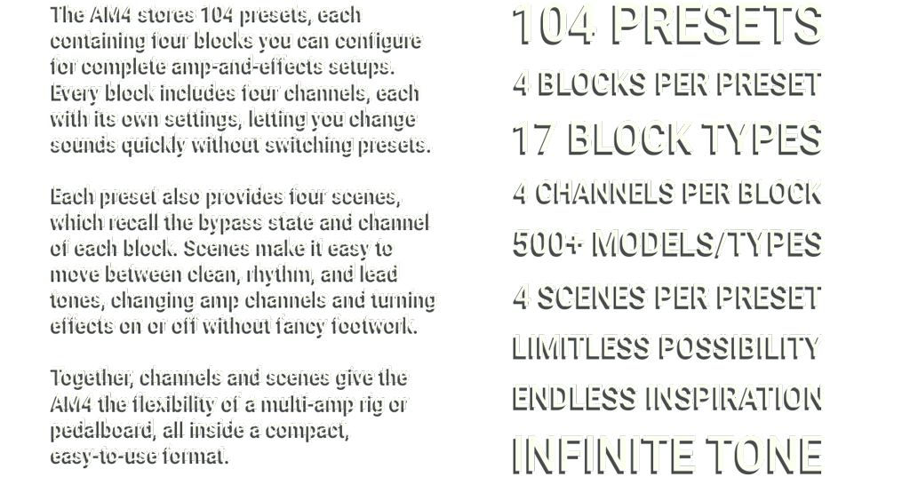 The amp block includes four channels, giving you gapless switching between four amp-and-cab tones in every preset. With 104 presets, and 240+ amp models, the AM4 covers the range of a warehouse full of amps.