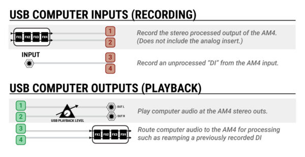 - 4×4 USB Audio – Record processed outputs, capture a DI, monitor computer audio, or re-amp tracks—all through USB.