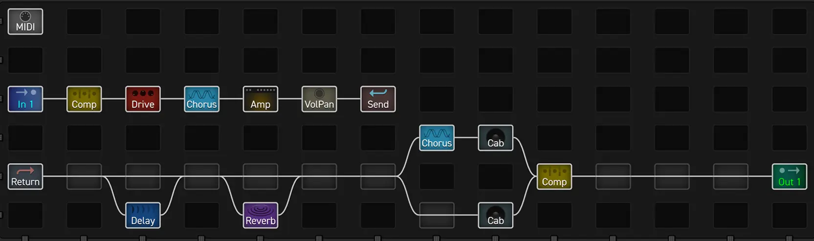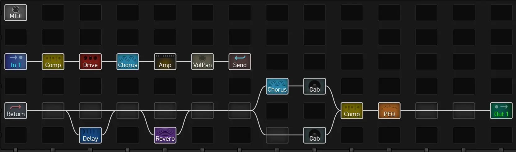 The cabs are split into two paths with same cabinet blocks but a separate chorus effect on the left cab to create a wide stereo image. Edo does this with probably all of his presets.