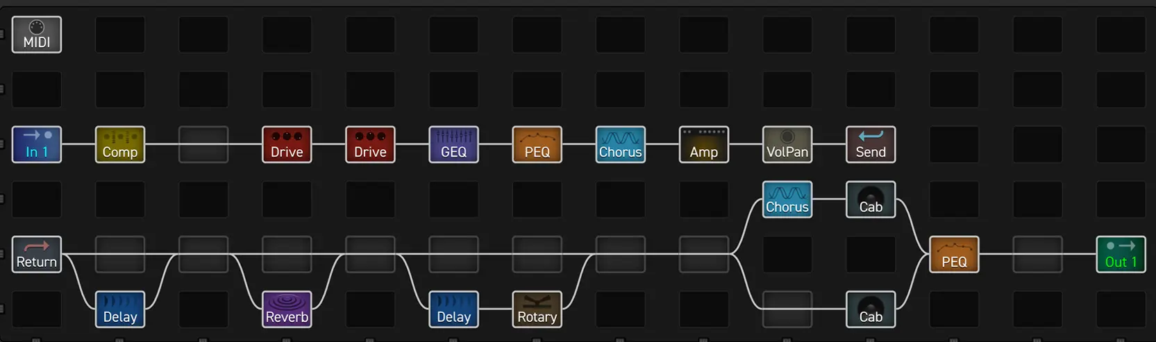 The Rotary block is where the magic happens. It’s tuned to emulate the classic Leslie speaker sound, adding a swirling, three-dimensional quality to your tone. The slow rate and carefully set depth parameters make it perfect for adding texture and movement, whether you’re playing clean or overdriven passages.